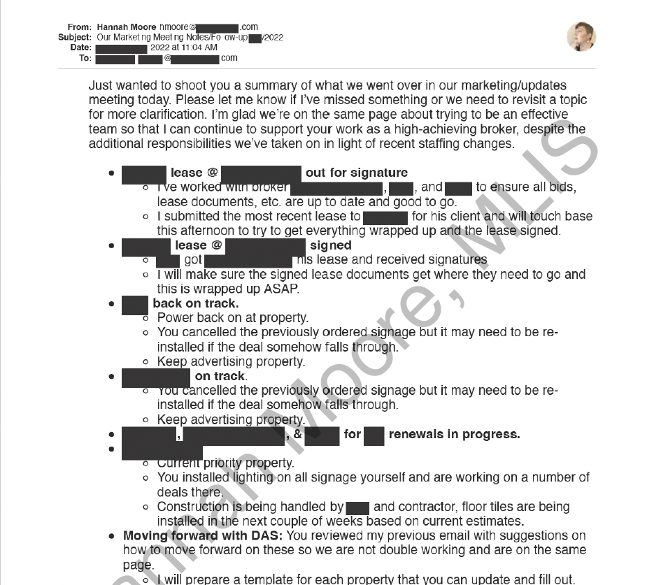 E-mail example featuring a meeting follow-up for several projects with a high-performer who has difficulty staying organized and working on a team.